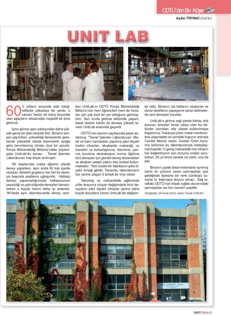 80 başlarında orada öğrenci olarak deney yaparken, aynı anda 60 kişi içerde olurduk, dörderli grupların herbiri bir deneyin başında saatlerce uğraşırdık. Haftaiçi deneyi yapamadığımızda haftasonunun sessizliği ve yalnızlığında deneyleri tamamlarken o büyük hacmi daha iyi anlardık. 90’larda aynı laboratuvarda deney verirken Unit Lab’ın ODTÜ Kimya Mühendisliği Bölümü’nün hem öğrencileri hem de hocaları için çok özel bir yer olduğunu görmüştüm. Son sınıfa gelince bölümde yaşam, basık tavanlı kantin ile devasa yüksek tavanlı Unit Lab arasında geçerdi.