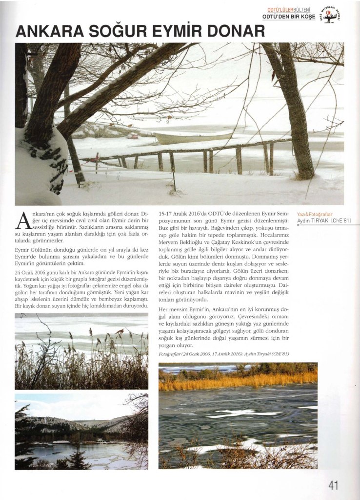 24 Ocak 2006 günü karlı bir Ankara gününde Eymir’in kışını kaydetmek için küçük bir grupla fotoğraf gezisi düzenlemiştik. Yoğun kar yağışı iyi fotoğraflar çekmemize engel olsa da gölün her tarafının donduğunu görmüştük. Yeni yağan kar ahşap iskelenin üzerini dümdüz ve bembeyaz kaplamıştı. Bir kayık donan suyun içinde hiç kımıldamadan duruyordu.