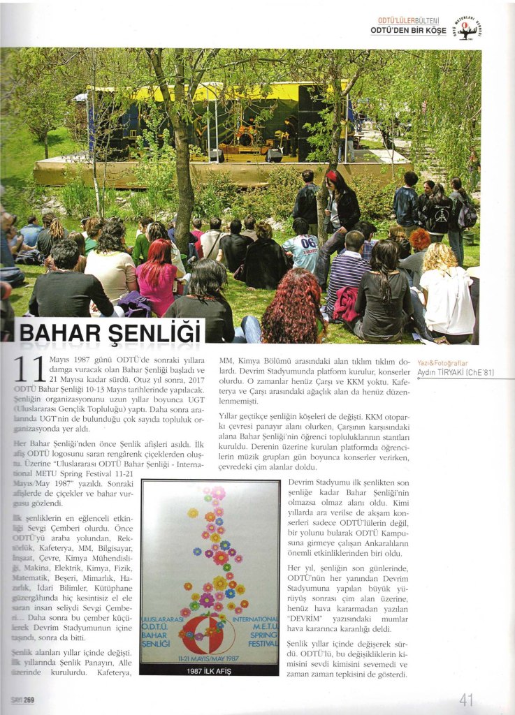 11 Mayıs 1987 günü ODTÜ’de sonraki yıllara damga vuracak olan Bahar Şenliği başladı ve 21 Mayıs’a kadar sürdü. Otuz yıl sonra, 2017 ODTÜ Bahar Şenliği 10-13 Mayıs tarihlerinde yapılacak. Şenliğin organizasyonunu uzun yıllar boyunca UGT (Uluslararası Gençlik Topluluğu) yaptı. Daha sonra aralarında UGT’nin de bulunduğu çok sayıda topluluk organizasyonda yeraldı.