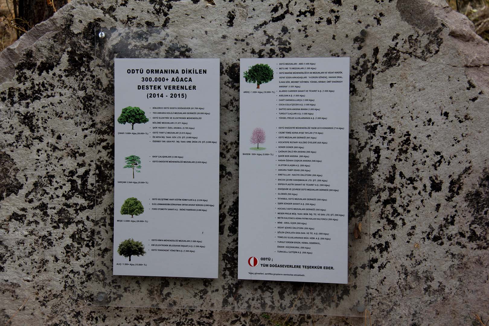 Diğer taşın üzerinde kampanya destekçileri ve kampanyada dikilen fidanların cinsleri yazılı: Çınar, sarıçam, meşe, alıç, ardıç, badem…