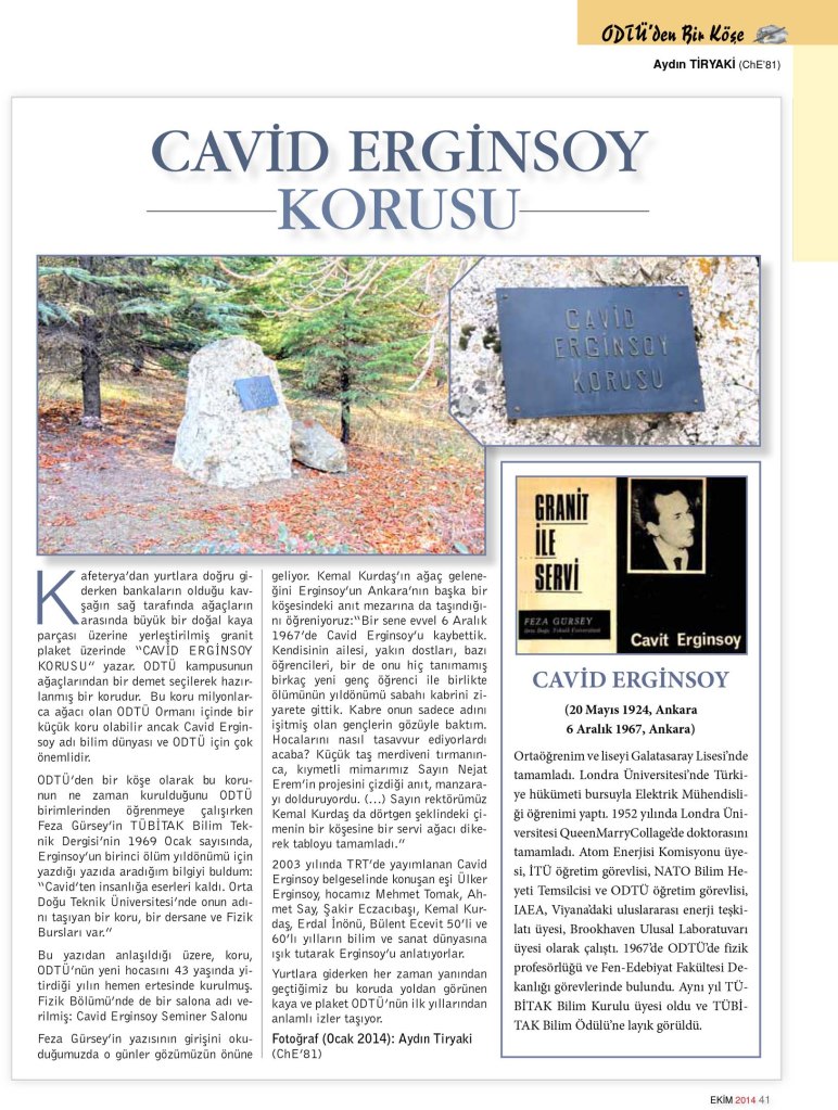 ODTÜ’den bir köşe olarak bu korunun ne zaman kurulduğunu ODTÜ birimlerinden öğrenmeye çalışırken Feza Gürsey’in TÜBİTAK Bilim Teknik Dergisi’nin 1969 Ocak sayısında, Erginsoy’un birinci ölüm yıldönümü için yazdığı yazıda aradığım bilgiyi buldum: “Cavid’ten insanlığa eserleri kaldı. Orta Doğu Teknik Üniversitesi’nde onun adını taşıyan bir koru, bir dersane ve Fizik Bursları var.”