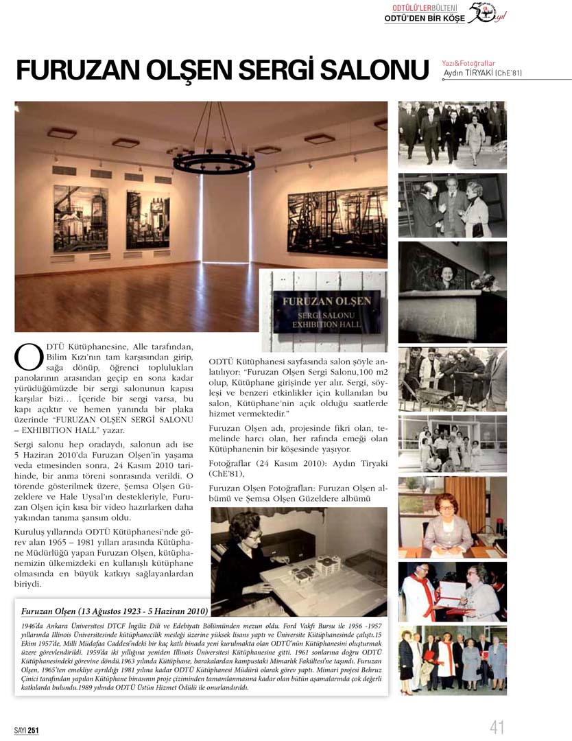 ODTÜ Kütüphanesine, Alle tarafından, Bilim Kızı’nın tam karşısından girip, sağa dönüp, öğrenci toplulukları panolarının arasından geçip en sona kadar yürüdüğümüzde bir sergi salonunun kapısı karşılar bizi… İçeride bir sergi varsa, bu kapı açıktır ve hemen yanında bir plaka üzerinde “FURUZAN OLŞEN SERGİ SALONU – EXHIBITION HALL” yazar.