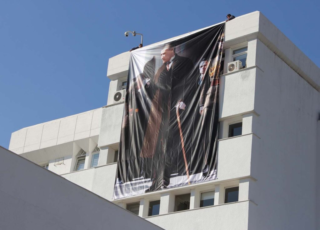 23 Nisanlarda, 19 Mayıslarda, 30 Ağustoslarda, 13 Ekimlerde, 29 Ekimlerde, 10 Kasımlarda, 27 Aralıklarda Rektörlük binasının çatısından üzerinde Atatürk’ün resmi bulunan büyük bir bez poster asılır. 2000 sonrası arşiv fotoğraflarından izlediğimizde bu posterin 2008 ve 2016’da değiştirildiğini görürüz. 2008’e kadar ve 2016’ya kadar kullanılan posterler Cemil Karababa imzalıyken 2016’dan itibaren kullanılmakta olan poster bir fotoğraftan hazırlanmış. Binanın Rektörlük ofislerinin olduğu balkonlara üç Türk Bayrağı asılırdı. 2016’dan sonra ortaya Atatürk Posteri iki yana bayraklar asılmaya başlandı.