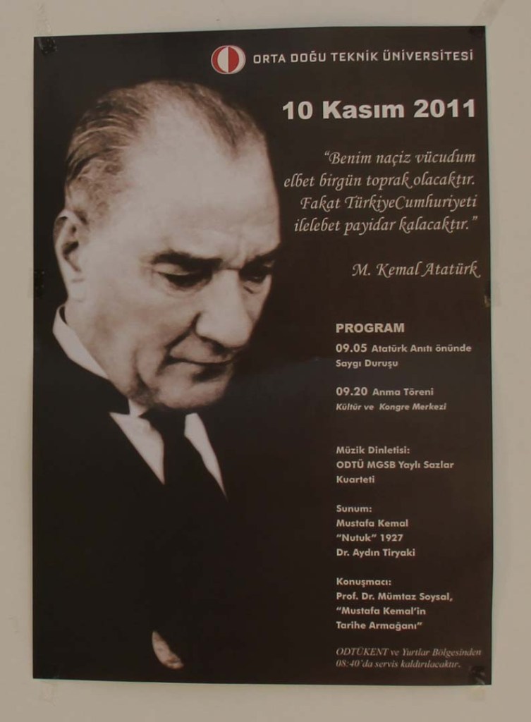 Her 10 Kasım için farklı bir Atatürk fotoğrafıyla hazırlanmış, anma programının da yeraldığı bir afiş ODTÜ’nün bütün binalarında, otobüslerinin arka camlarında asılır. Afişteki fotoğrafın aynısı o gün kalplerin üzerine iğnelenmiştir, Atatürk Anıtı’nın önünde başlayan ve KKM Kemal Kurdaş Salonunda süren anma programında…