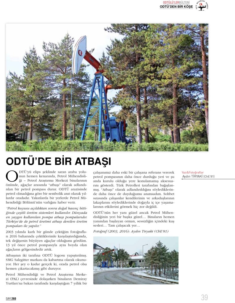 ODTÜ’yü elips şeklinde saran araba yolunun hemen kenarında, Petrol Mühendisliği – Petrol Araştırma Merkezi binalarının önünde, ağaçlar arasında “atbaşı” olarak adlandırılan bir petrol pompası durur. ODTÜ arazisinde petrol olmadığına göre bir sembolik anıt olarak yıllardır oradadır. Yakınlarda bir yerlerde Petrol Mühendisliği Bölümünün varlığını haber verir.