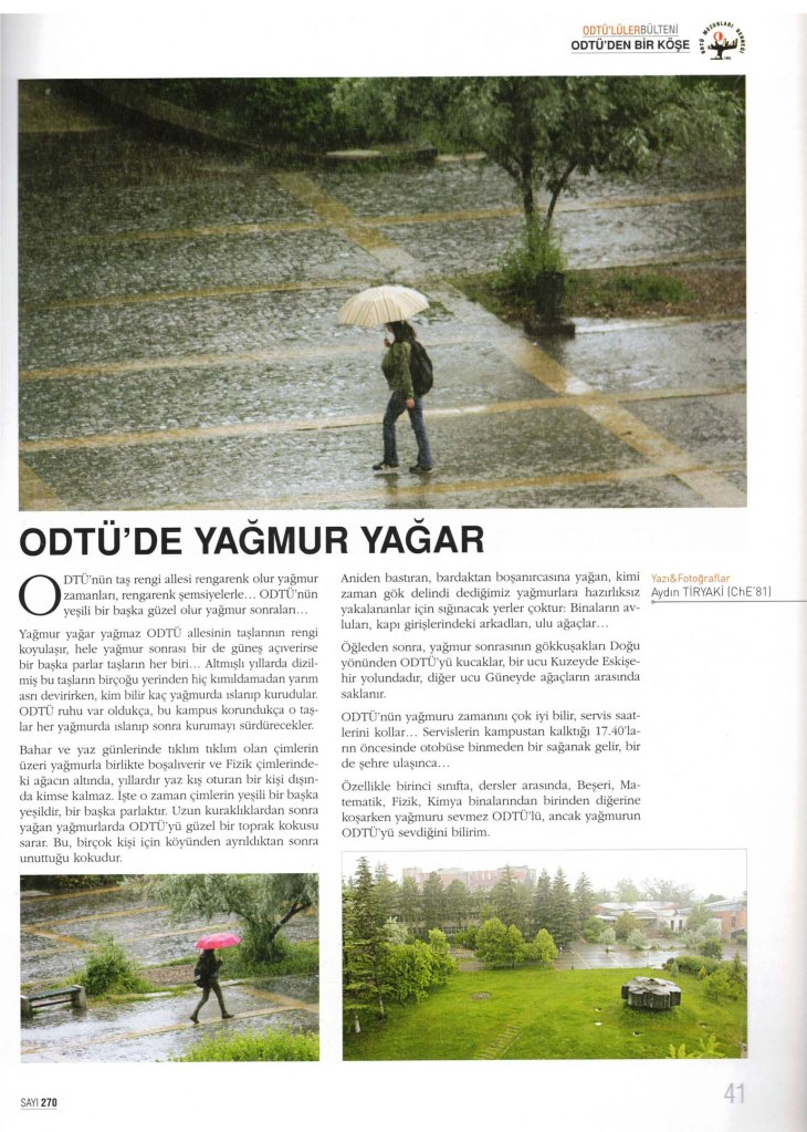 Özellikle birinci sınıfta, dersler arasında, Beşeri, Matematik, Fizik, Kimya binalarından birinden diğerine koşarken yağmuru sevmez ODTÜlü, ancak yağmurun ODTÜ’yü sevdiğini bilirim.