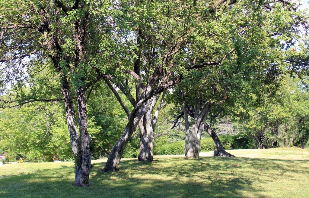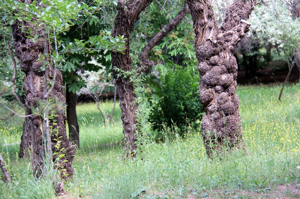 Kafeteryadan yurtlara doğru araba yolunun sağında gövdesi yumru yumru olmuş, dalları değişik şekillerde özgürce uzanmış çok sayıda ağaç görürüz.