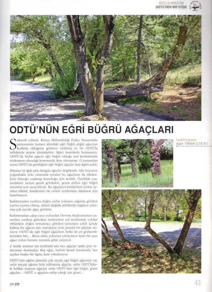 Seksenli yıllardı, Kimya Mühendisliği Fiziko binasındaki penceremin hemen altındaki eğri büğrü söğüt ağacının kesilmiş olduğunu görünce üzülmüş ve bir ODTÜlü refleksiyle peşine düşmüştüm. Ağacı kesenlerle konuşunca, ODTÜ’de hiçbir ağacın eğri büğrü olduğu için kesilmesinin sözkonusu olmadığı konusunda ikna olmuştum. O zamandan sonra ODTÜ’de gördüğüm eğri büğrü ağaçlar hep ilgimi çekti.
