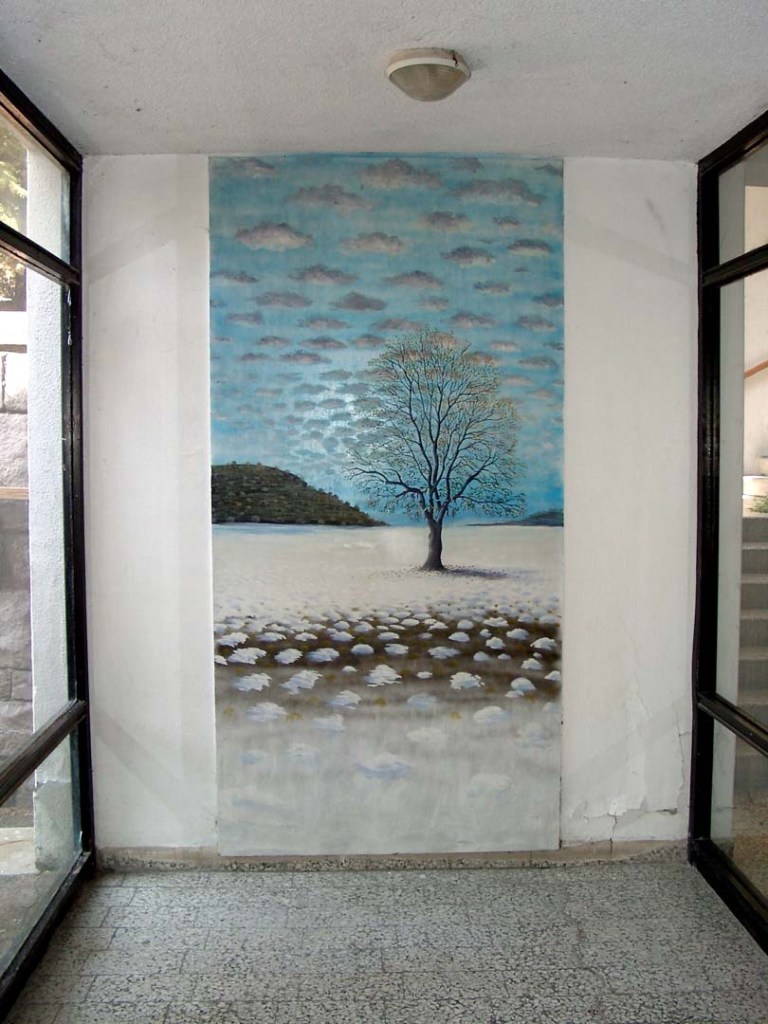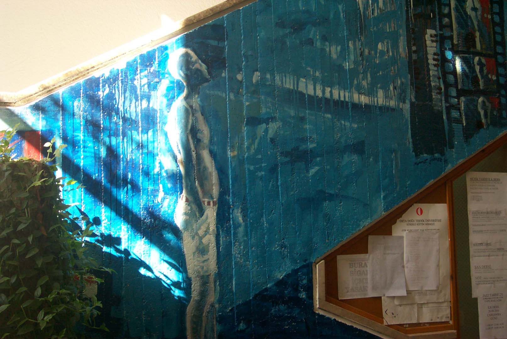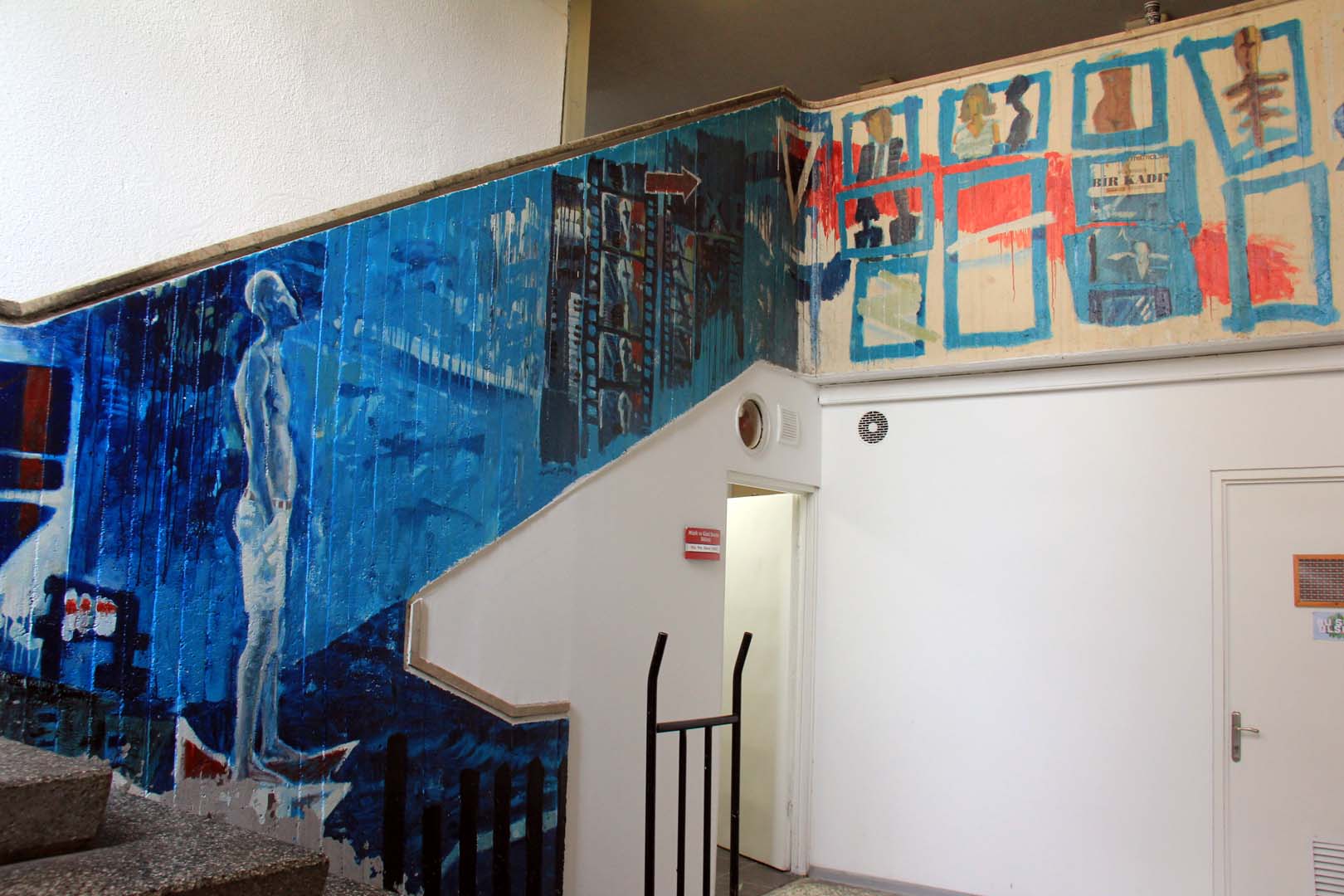 Merdivenin tırabzanının dış yüzüne çizilmiş resmin 2001 yılındaki fotoğraflardaki parlak renkler 2017 fotoğraflarında aynen duruyor. 1991 Mehmet Yılmaz imzalı resimler, çıplak betonun ne kadar iyi bir tuval olduğunun kanıtı olarak bugüne gelmiş.