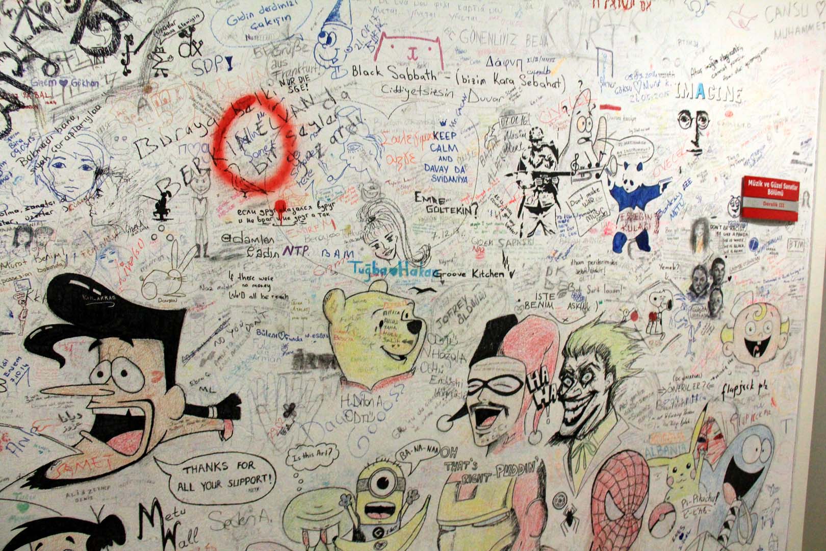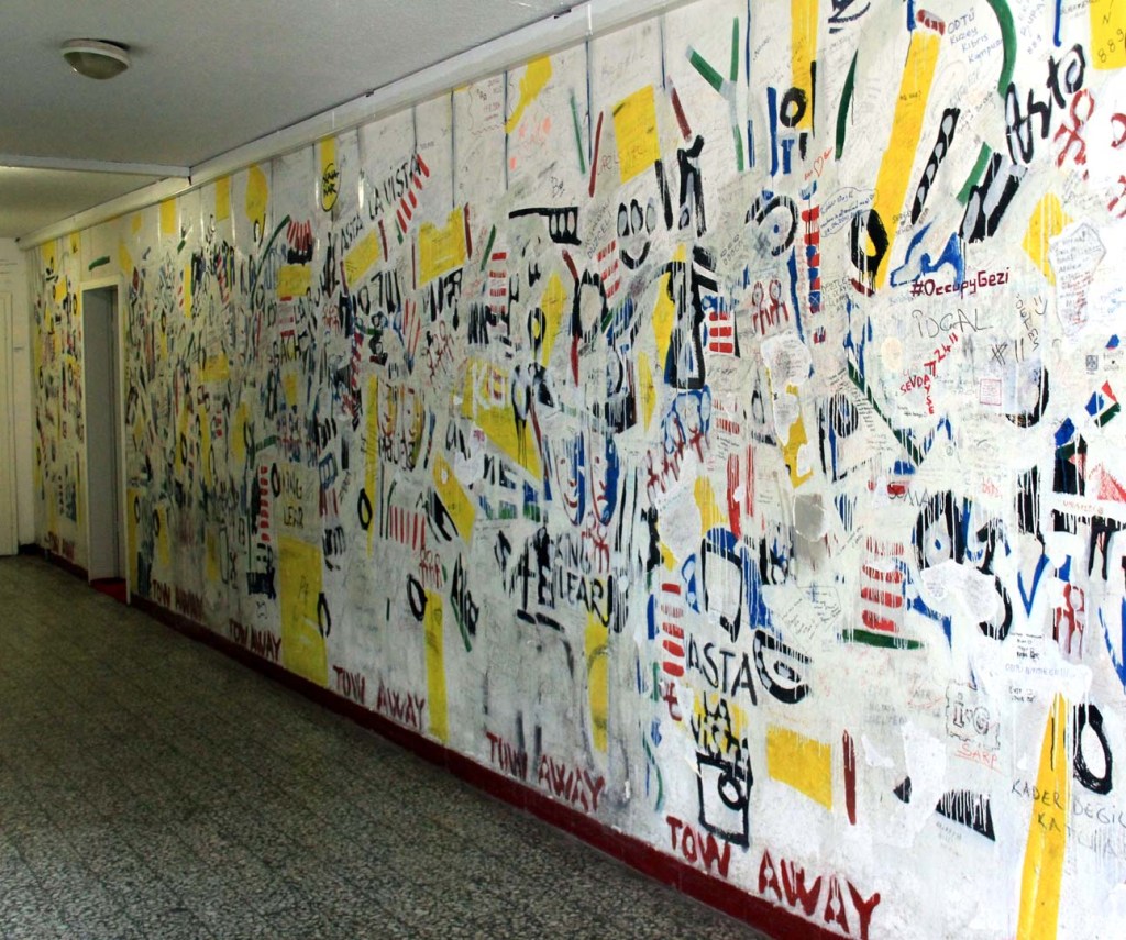 Girişin sağ tarafında Erdal İnönü Oda Müziği Salonuna giden koridorun sağında ve solundaki duvarlar grafiti ile ya da grafiti kokan çalışmalarla doldurulmuş. Sol tarafta Mehmet Yılmaz imzalı bir resim bir zamanlar koridorun sonuna kadar giderken devamı bir kazaya uğramış olmalı ki, şimdi orada daha sonra yapılmış grafitiler duruyor. Koridorun sağ tarafındaki duvar 1991 Tansel Türkdoğan imzalı bir resimle baştan sona kaplanmış. Resmin kimi yerlerinde sonradan eklendiği izlenimi veren grafitiler de bulunuyor.
