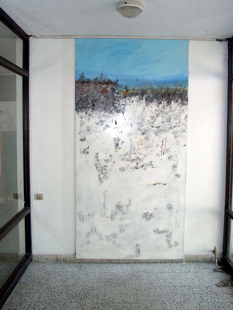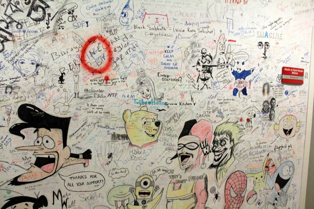 Kütüphanenin alt katında Müzik ve Güzel Sanatlar Bölümü vardır. Buraya gitmek için Kütüphaneye Matematik Bölümünün karşısındaki kapıdan girerseniz sağa dönüp merdivenlerden inmeniz gerekir. Bir kapı da rektörlüğün karşısındadır, o kapıdan girerseniz doğrudan duvarları görürsünüz, rengarenk duvarlar… Dış kapı ve iç kapı arasındaki iki duvarda yerden tavana kadar iki resim durur. Sol tarafta Yalçın Gökçebağ imzalı, sağ tarafta ise M. Zahit Büyükişleyen imzalı resimler vardır.