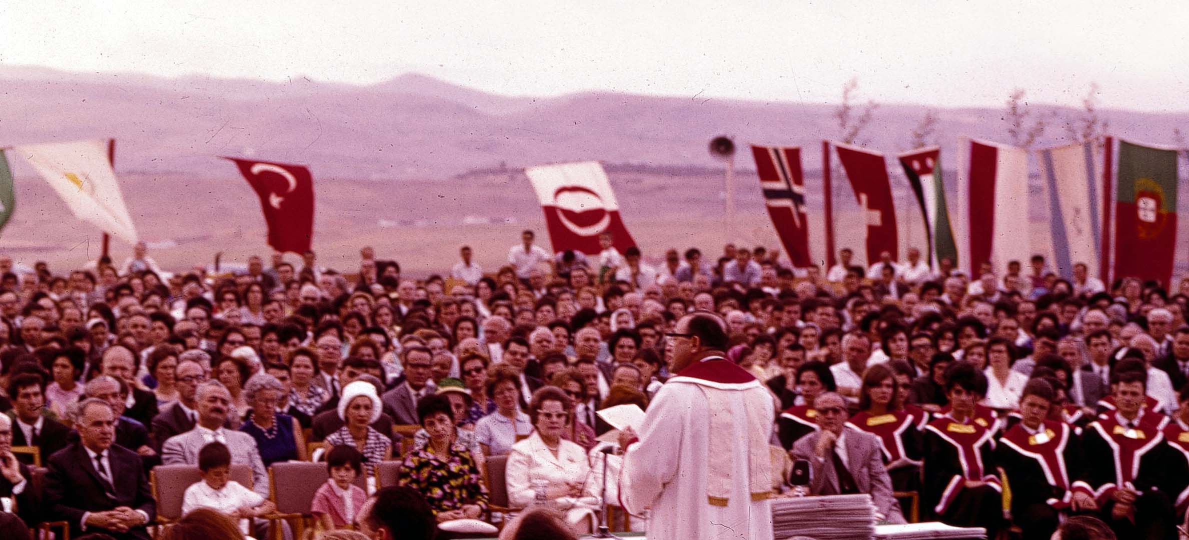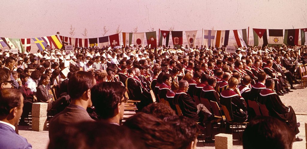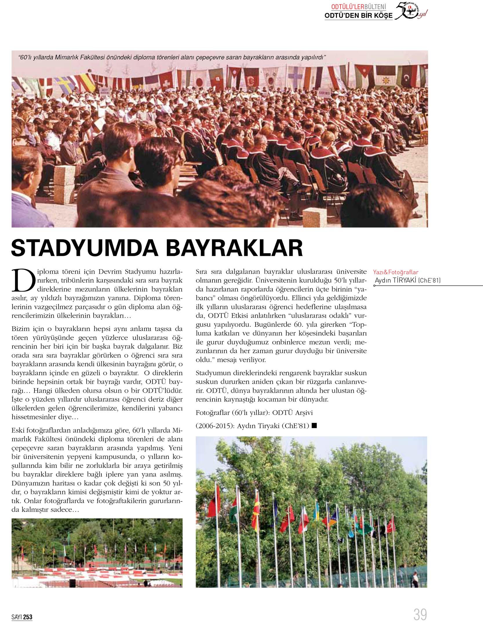 Eski fotoğraflardan anladığımıza göre, 60’lı yıllarda Mimarlık Fakültesi önündeki diploma törenleri de alanı çepeçevre saran bayrakların arasında yapılmış. Yeni bir üniversitenin yepyeni kampusunda, o yılların koşullarında kimbilir ne zorluklarla bir araya getirilmiş bu bayraklar direklere bağlı iplere yanyana asılmış. Dünyamızın haritası o kadar çok değişti ki son 50 yıldır, o bayrakların kimisi değişmiştir kimi de yoktur artık. Onlar fotoğraflarda ve fotoğraftakilerin gururlarında kalmıştır sadece…