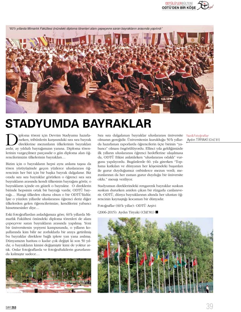 Stadyumun direklerindeki rengarenk bayraklar suskun suskun dururken aniden çıkan bir rüzgarla canlanıverir. ODTÜ, dünya bayraklarının altında her ulustan öğrencinin kaynaştığı kocaman bir dünyadır.