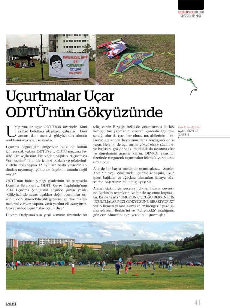 Uçurtma özgürlüğün simgesidir, belki de bunun için en çok yakışır ODTÜ’ye… ODTÜ mezunu Feride Çiçekoğlu’nun kitabından yapılan “Uçurtmayı Vurmasınlar” filminde içimizi burkan ve gözlerimizi dolu dolu yapan 12 Eylül’ün baskı yıllarının ardından uçurtmaya yüklenen özgürlük umudu değil miydi?