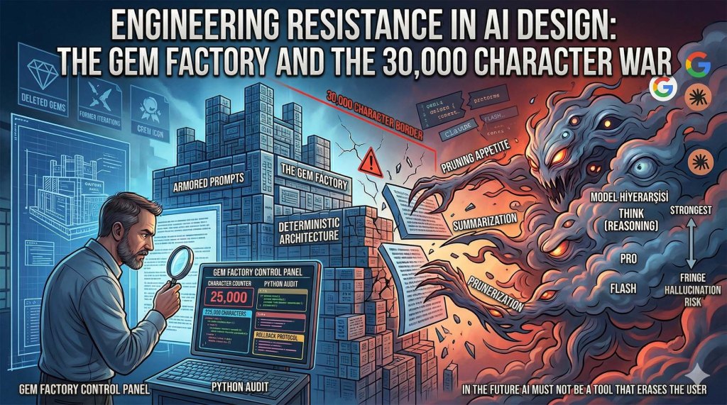 Detailing the “Gem Factory” project by Aydın Tiryaki, this article explores the technical boundaries of AI design, specifically the critical 30,000-character attention limit, the performance gap between models (Flash, Pro, Reasoning), and the engineering resistance—via “armored prompts”—against AI’s inherent urge to prune and summarize. Highlighting the clash between deterministic engineering and stochastic AI chaos, this version also includes the complete 8-section original dialogue log between the author and Gemini, providing transparent, firsthand insight into the struggles and solutions of the design process.